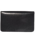 • Holds ID/business card card behind clear PVC window on back panel hidden by Leather flap
